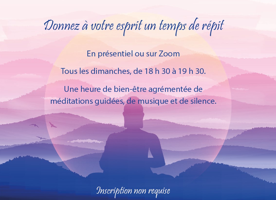 Tous les dimanches soirs Soirée méditative – Oasis de paix – de 18 h 30 à 19 h 30 Et si, pendant une heure, tu appuyais sur “pause”? Juste pour t’asseoir… [...]